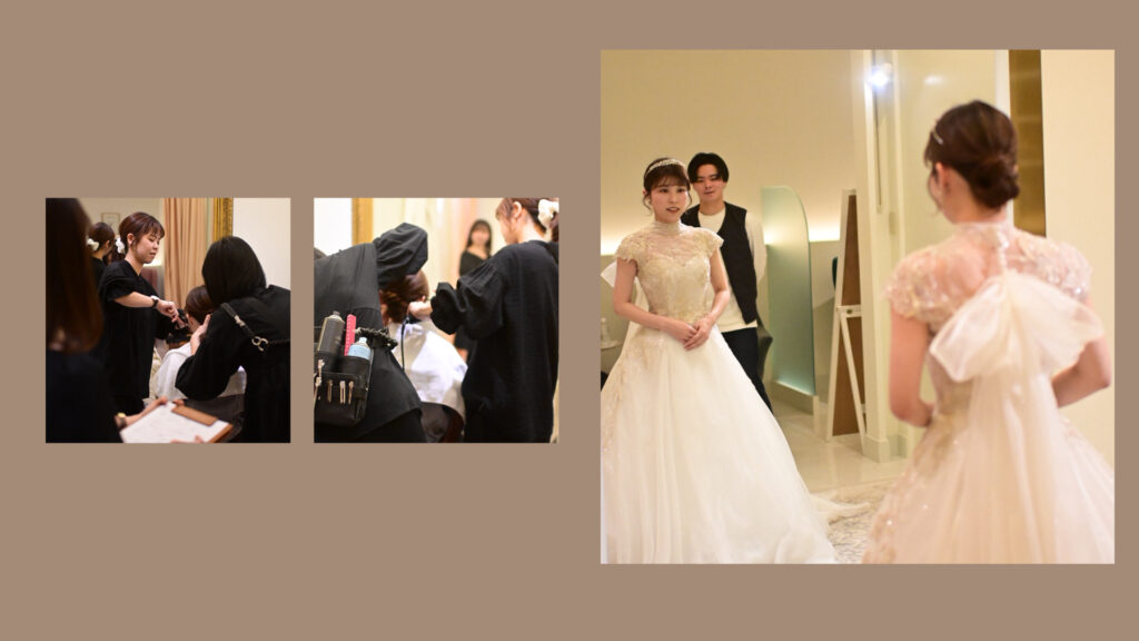 イベント当日は、プロによるメイクを仕上げ、お選びいただいたウェディングドレスを纏った