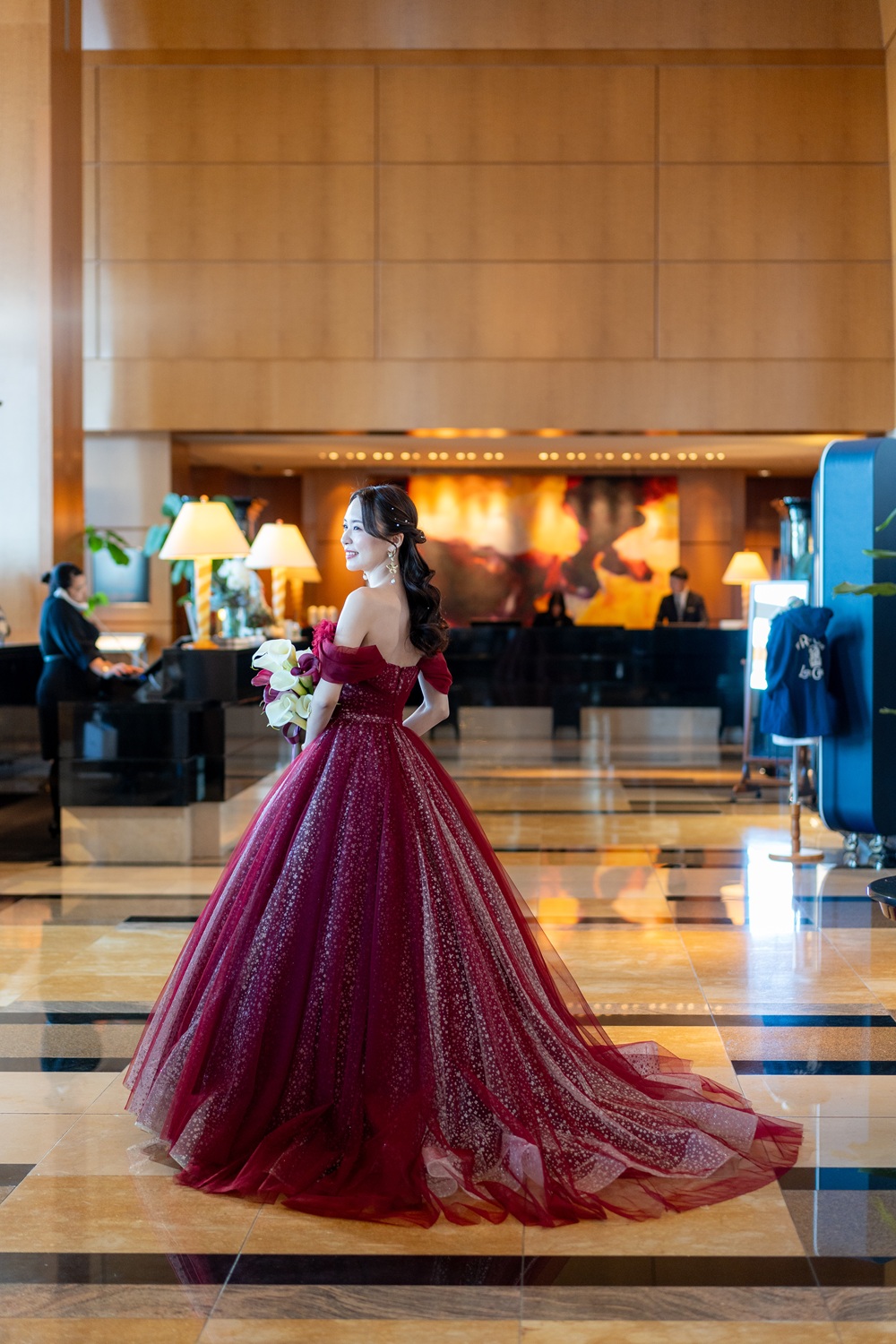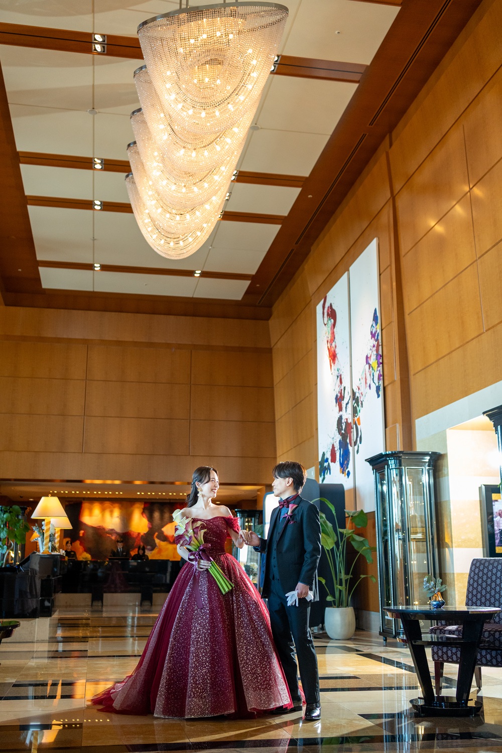 ボルドーのカラードレスとブラックタキシードが美しく映え