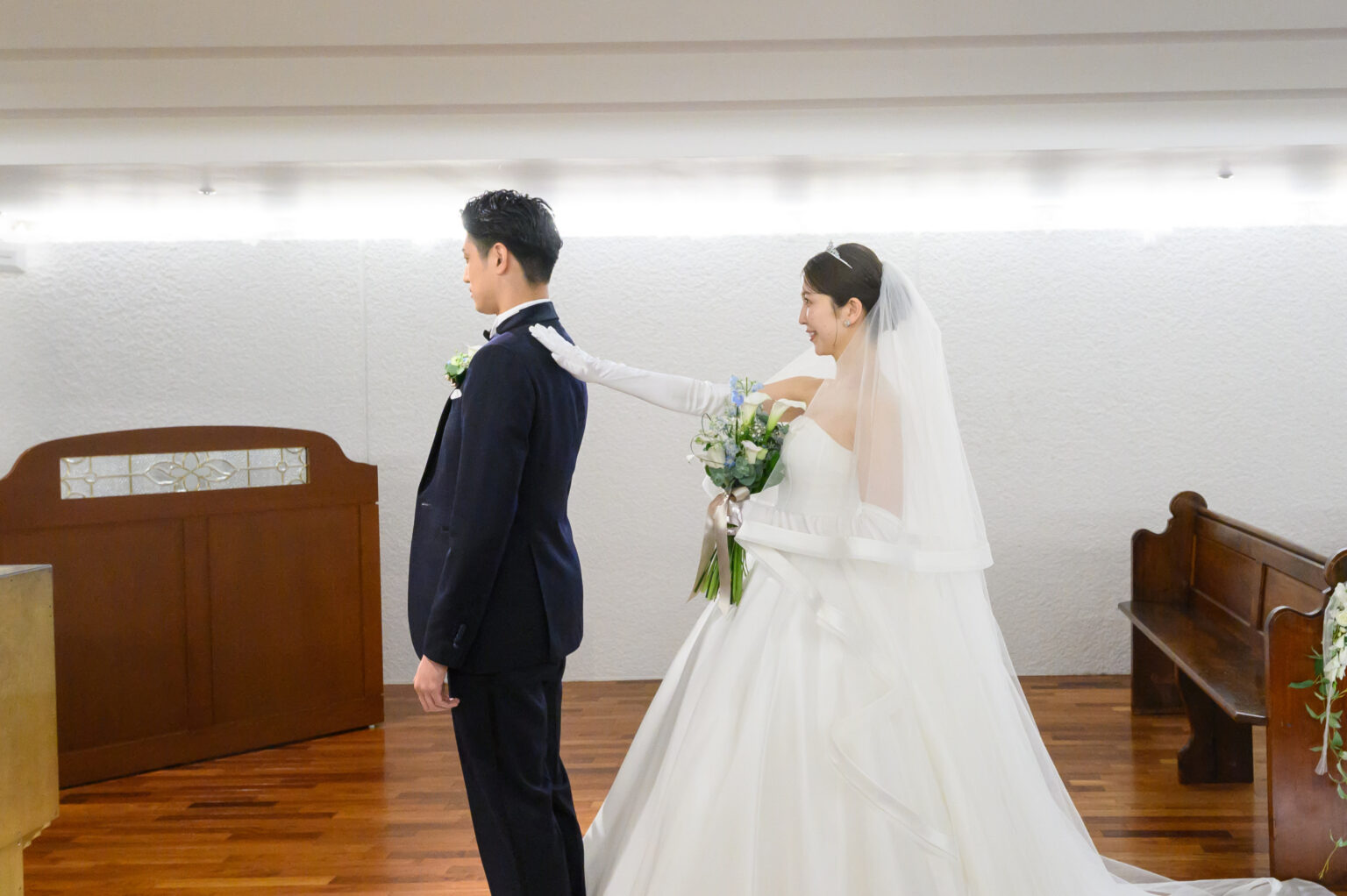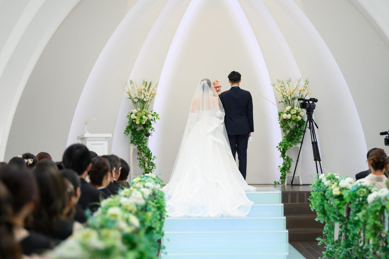露出をほどよく抑えた端正なラインが、YURIEさんの気品と、挙式の厳かさを一段と高めていました。