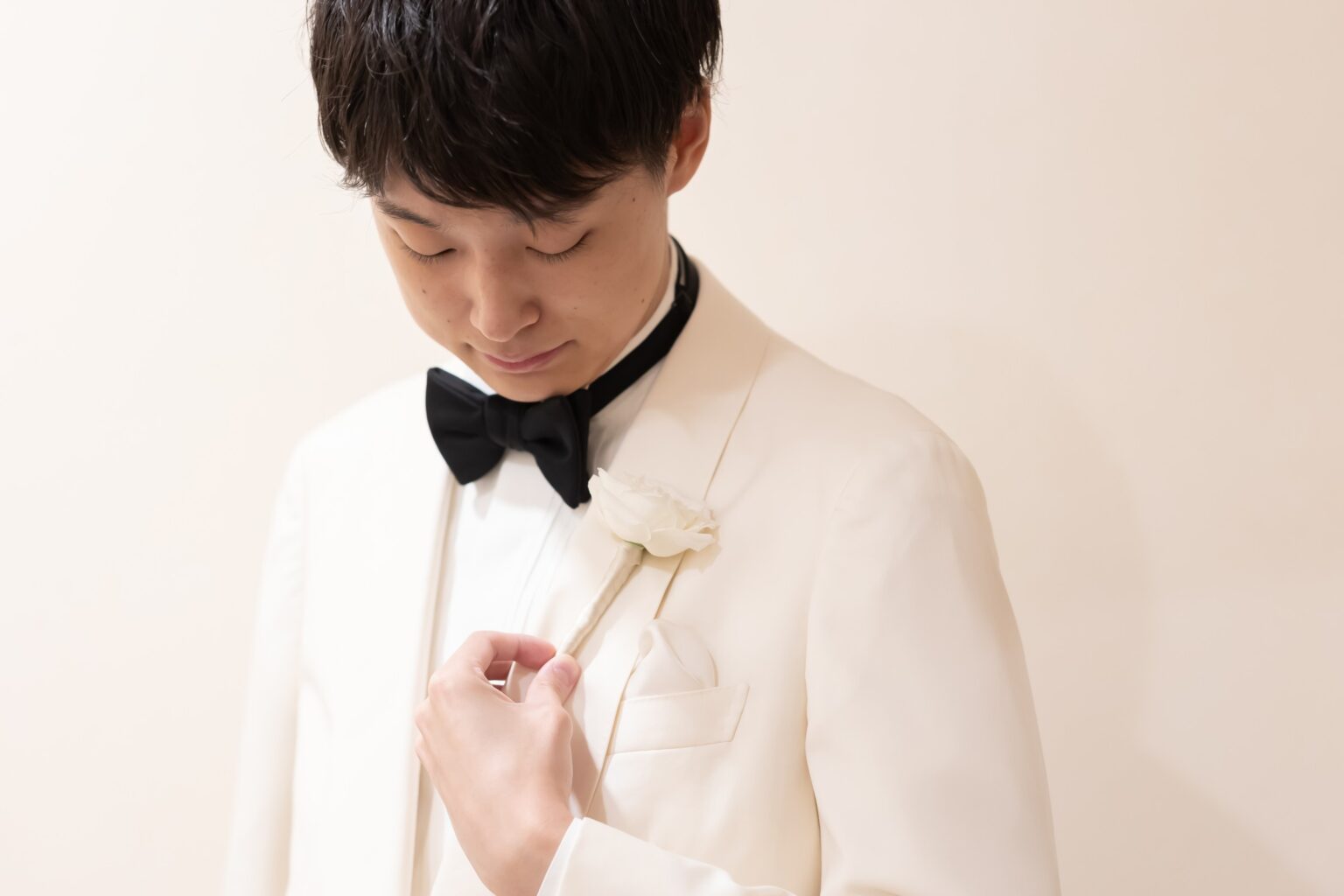 TAKUHIROさんのタキシードはクラシックな蝶ネクタイとカマーバンドスタイル。