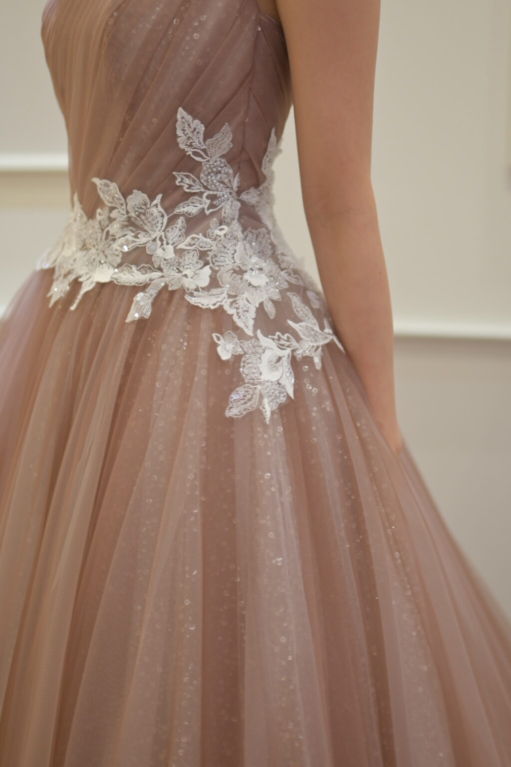 モカとホワイト、幾重にも重なるチュールの中には、繊細なラメが一面に施された生地が重ねられ