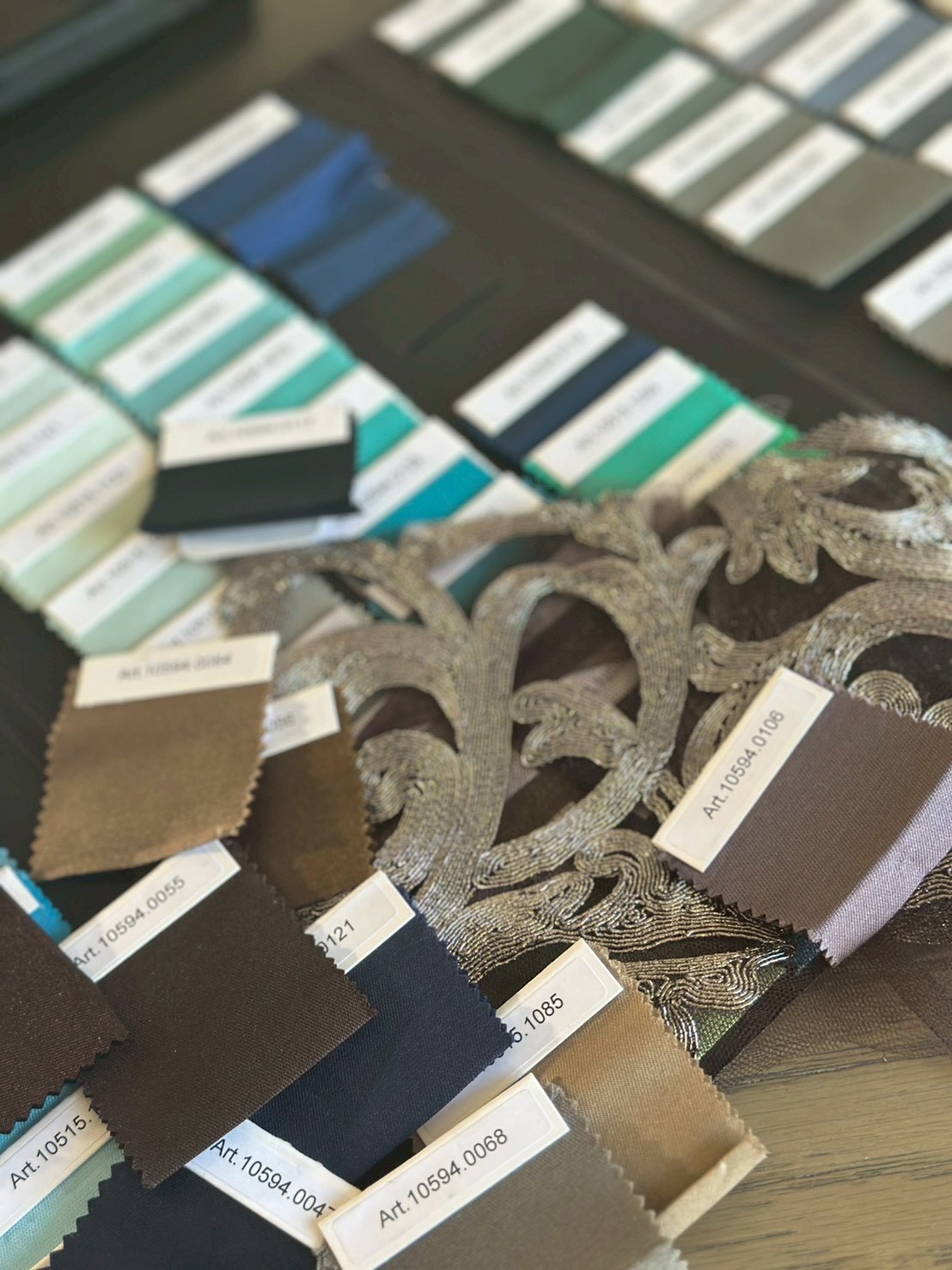 数あるカラーサンプルを幾度も生地にあて