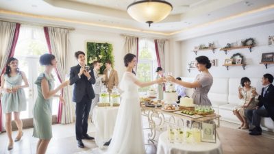 お待合スペースに隣接したテラスでは色鮮やかなカクテルやフィンガーフードを用意し、海外ウエディングのような雰囲気。トワイライトタイムにはキャンドルや温かみのある照明に包まれて幻想的な雰囲気も楽しめ、進行や演出に合わせて館内を終日貸切にした動きのあるパーティを実現できる。