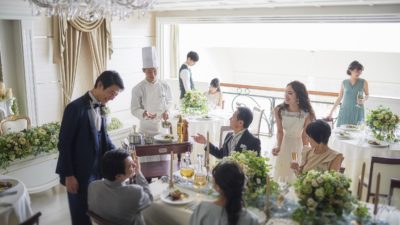 幅広い世代が出席する晴れの日にふさわしい、箸でも食べられる「フレンチ・ジャポネ」をご用意。温かいものは温かいまま、冷たいものは冷たいまま、隣接した専用キッチンからベストのタイミングでテーブルに運ばれた一皿一皿は、ゲストを自然と笑顔にさせ、おもてなしに溢れたパーティを演出。