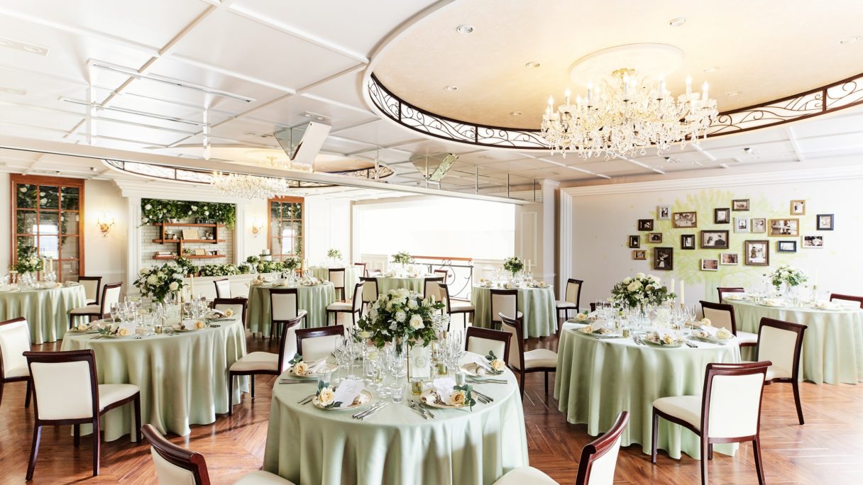 式のフィナーレを彩る『フラワースコール』は、スタッフからゲストへのサプライズ演出。全館貸切だからこそ、スタッフ一丸となってパーティを盛り上げる。温かみのあるオフホワイトを基調にした大人なパーティ空間は、どんなカラーコーディネートにも映えるから、自分色に染められる。