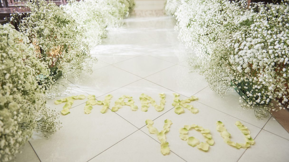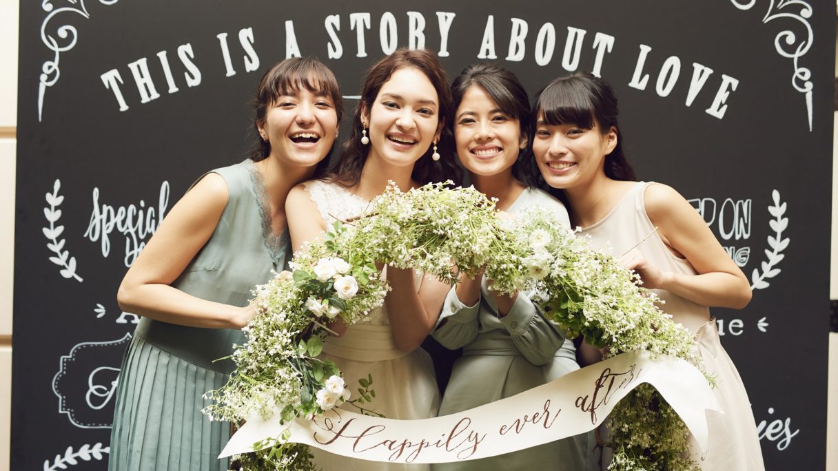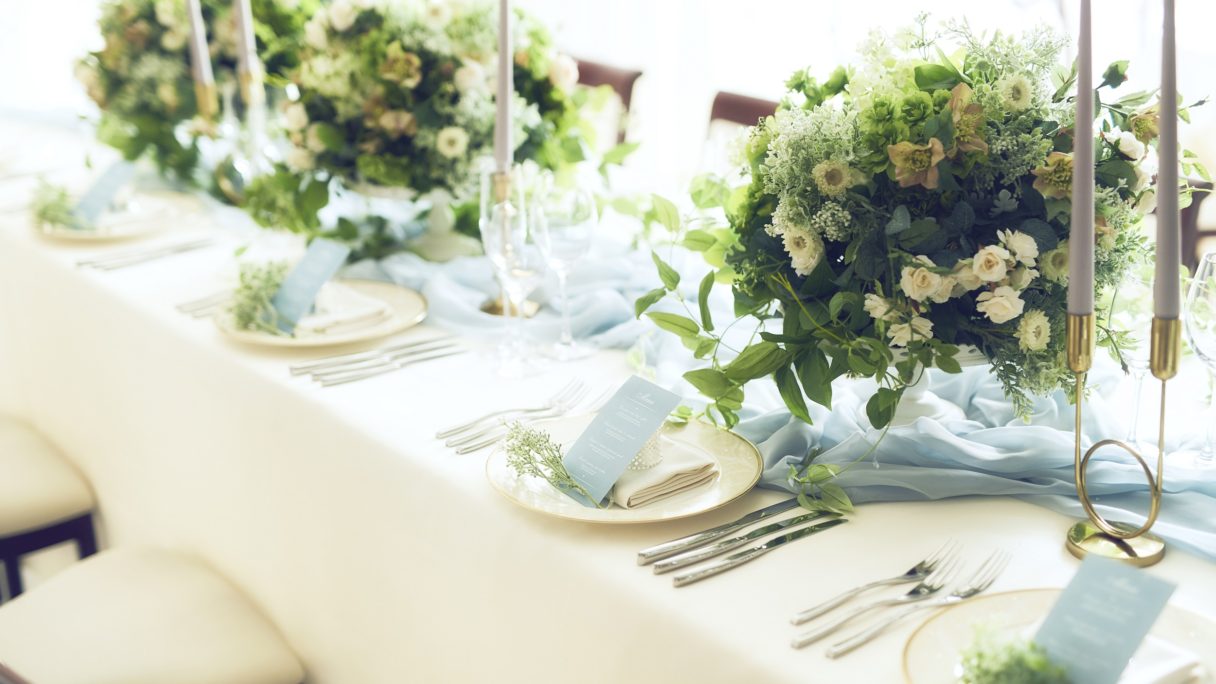 式のフィナーレを彩る『フラワースコール』は、スタッフからゲストへのサプライズ演出。全館貸切だからこそ、スタッフ一丸となってパーティを盛り上げる。温かみのあるオフホワイトを基調にした大人なパーティ空間は、どんなカラーコーディネートにも映えるから、自分色に染められる。